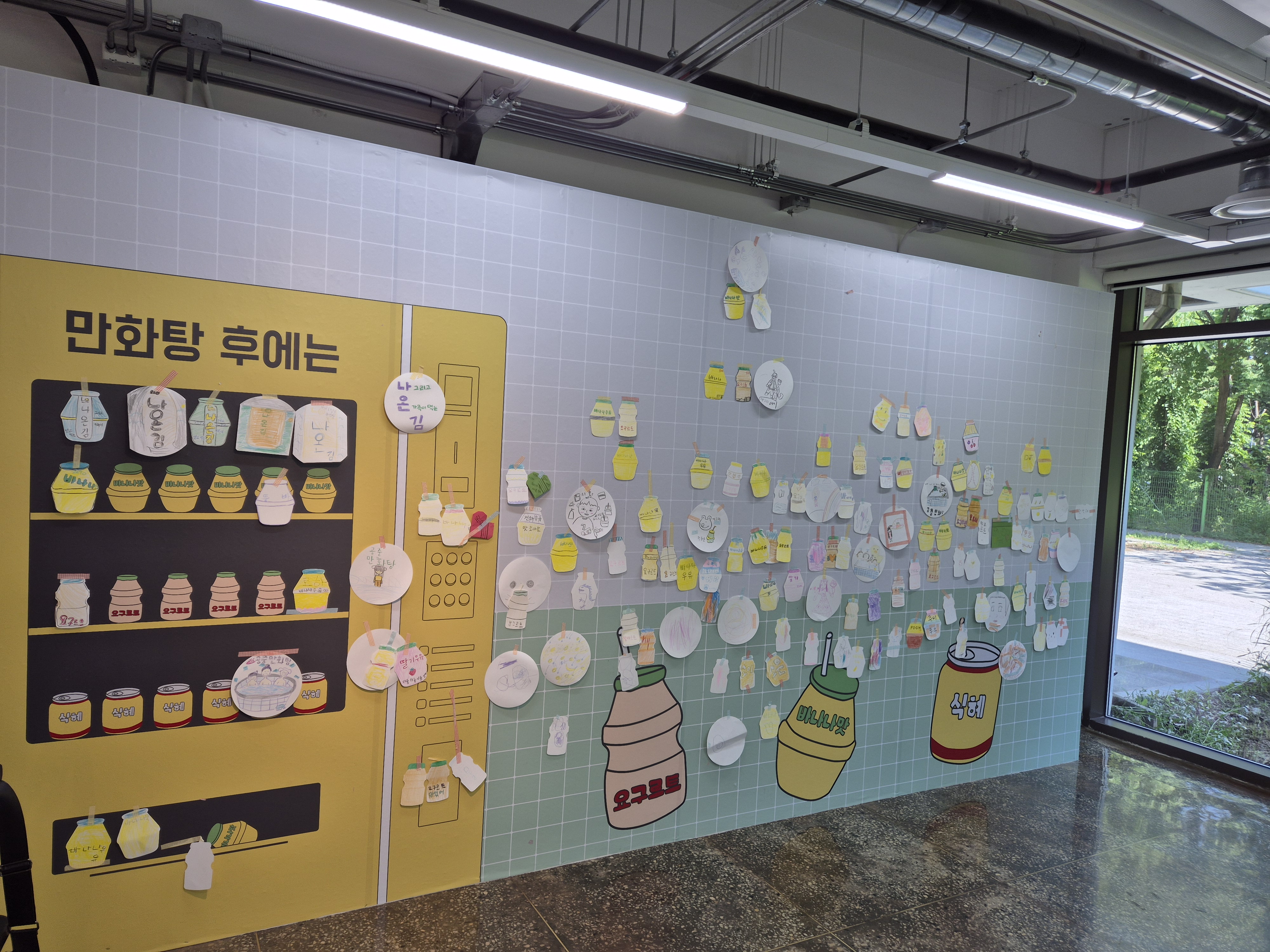 1층에 들어서자마자 공중 만화탕 전시회 이미지가 벽면에 좌~악~
