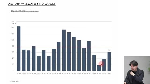 - 서울의 주택구입 물량 지수는 중간 소득 가구가 대출로 구매할 수 있는 아파트의 수를 나타내며, 현재 수치는 과거 10년 전의 절반에도 미치지 않는다.