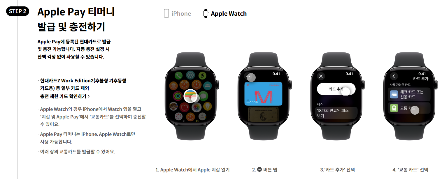 - Apple 지갑 앱: 애플페이에 등록된 현대카드로만 충전 가능합니다.
