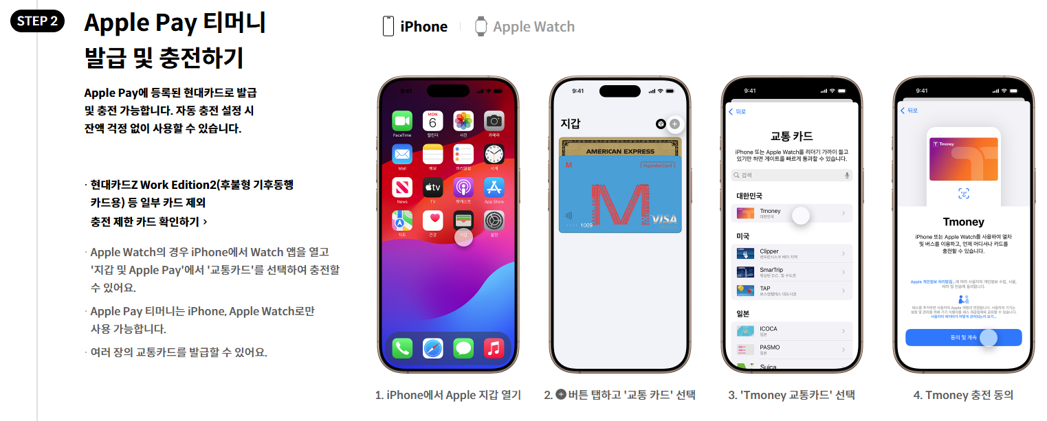 애플페이를 통해 티머니 카드를 충전하려면 애플페이에 등록된 현대카드가 필요합니다. 다른 카드사 카드를 사용하려면 '모바일티머니 앱'을 통해 충전해야 해요.