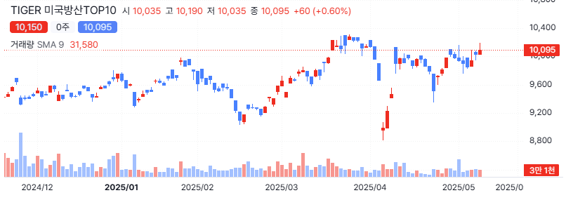 | TIGER 미국방산TOP10 | 미래에셋 | 2024/10/25 | 205억원 | 2,050,000주 | 10,095원 | RTX, 보잉, 제너럴 다이나믹, 록히드 마틴 |