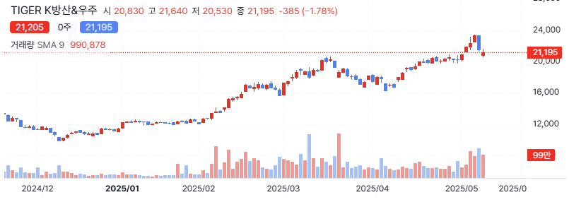 - 미래에셋자산운용의 TIGER K방산&우주 ETF가 있으며, 각 ETF는 방위산업관련 주식으로 구성되어 있음.