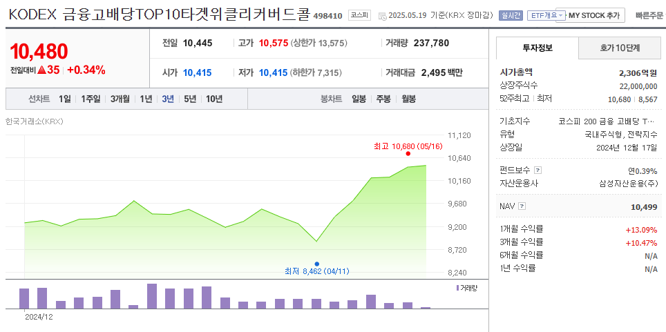 - 특징: 금융 업종 전반에 투자하는 대표 ETF로서, 국내 고배당 금융주 10개를 선별해 투자하며, 커버드콜 전략(콜옵션 매도) 을 활용해 추가 수익을 창출하는 종목