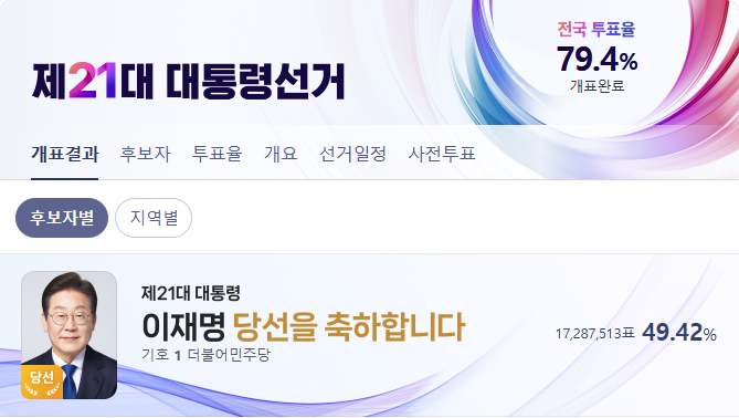 - 대통령 당선인: 더불어민주당 이재명 후보가 최종 득표율 49.42%로 당선되었습니다.