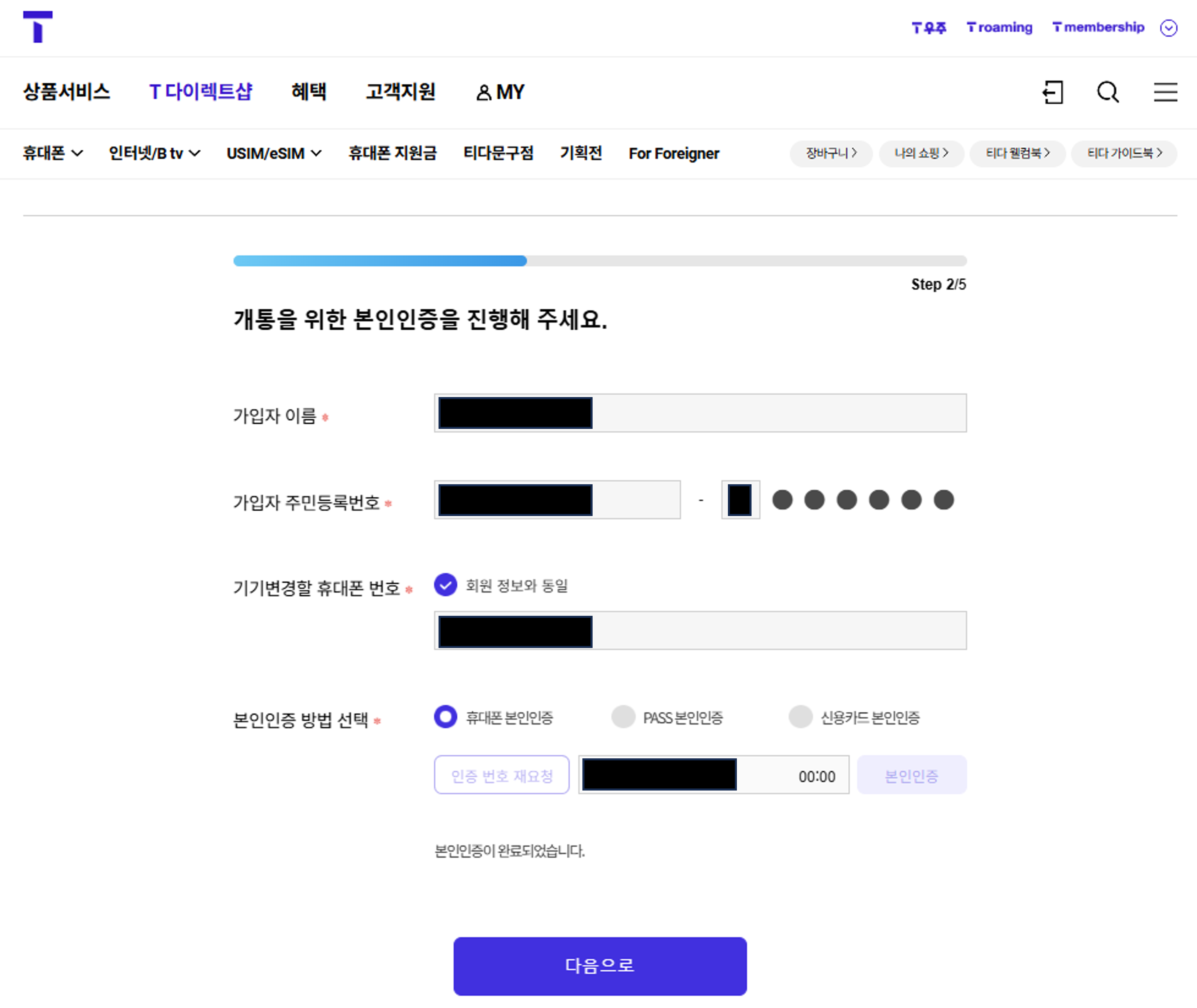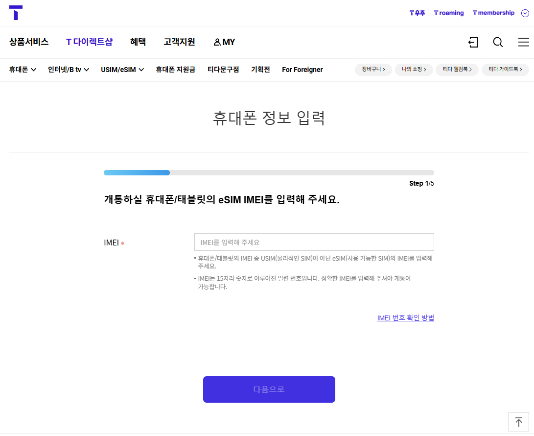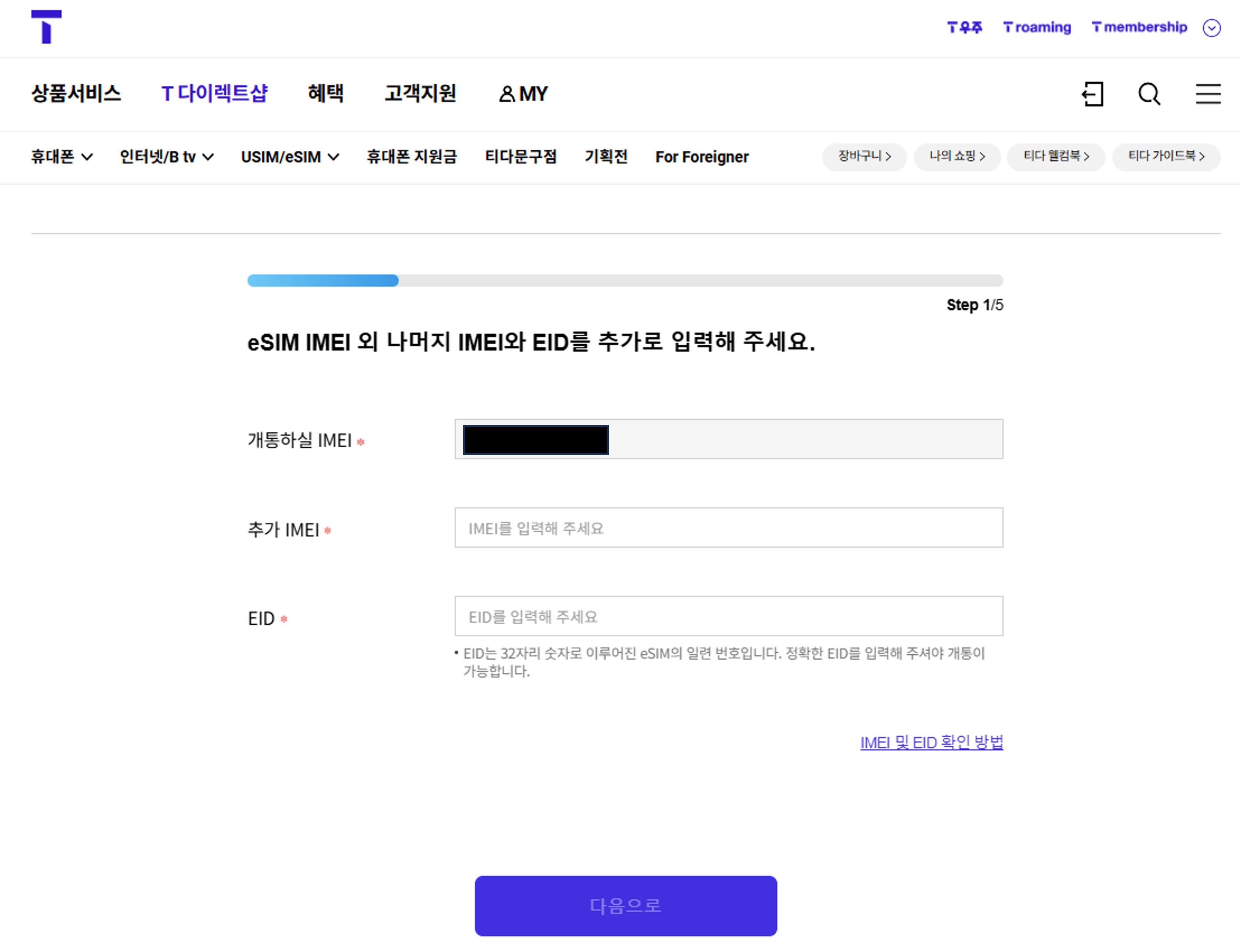 4. 순서에 따라 eSIM에서 사용할 IMEI, EID, USIM용 IMEI를 차근차근 넣고, 본인인증 후 진행하면 된다.