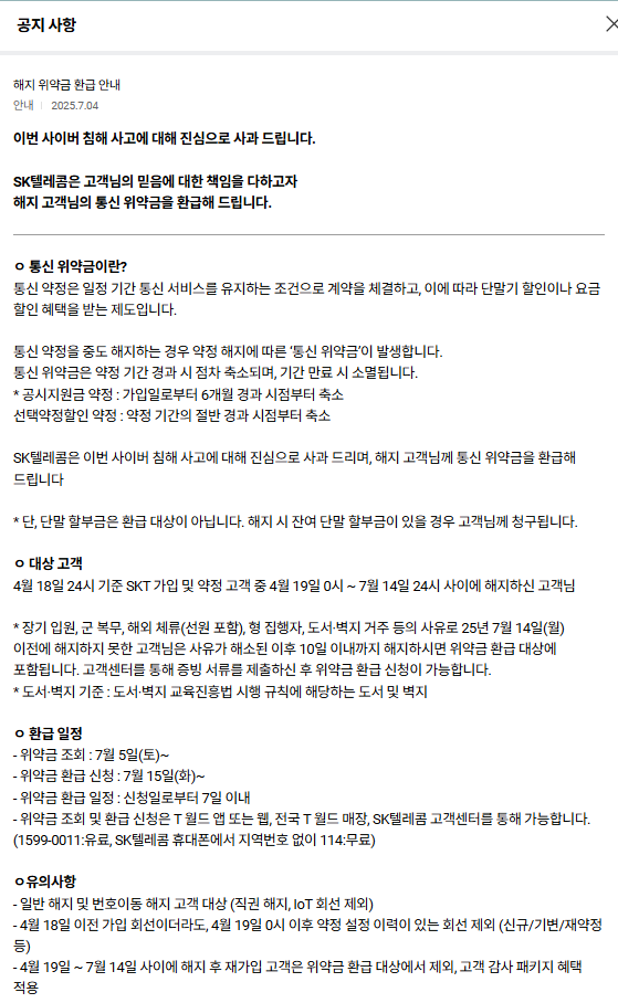 SKT의 최근 사이버 침해사고로 인해 마음고생이 많으셨을 텐데요. 위약금 환급 혜택을 놓치지 않고 꼭 신청하셔서 정당한 권리를 찾으시길 바랍니다. 😊